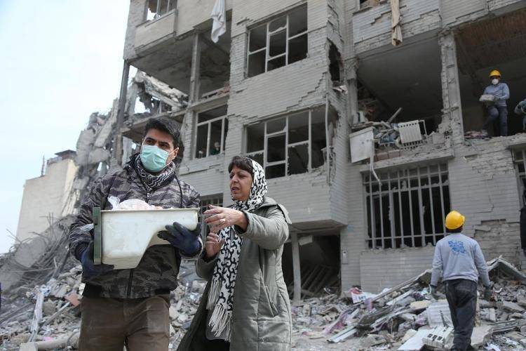 3月12日,在伊朗首都德黑兰,市民站在建筑废墟前。新华社记者 沙达提 摄