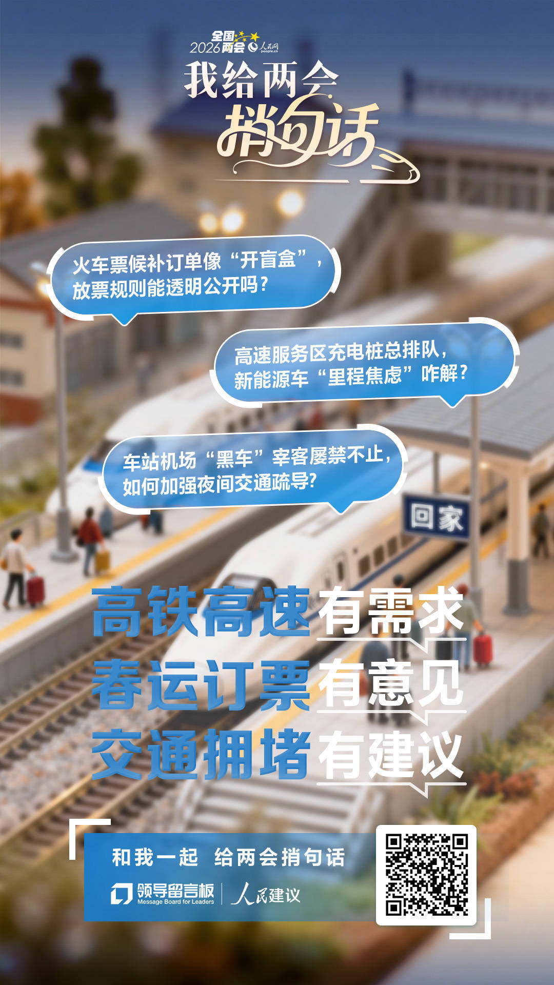 关于春运回家,你还有哪些期待?不管是对高铁高速的需求、有关春运订票的意见,还是关于解决交通拥堵的建议,都可以参与人民网2026年“我给两会捎句话”建言征集活动,意见建议直达“一把手”们,让归途更顺畅,让出行更安心。